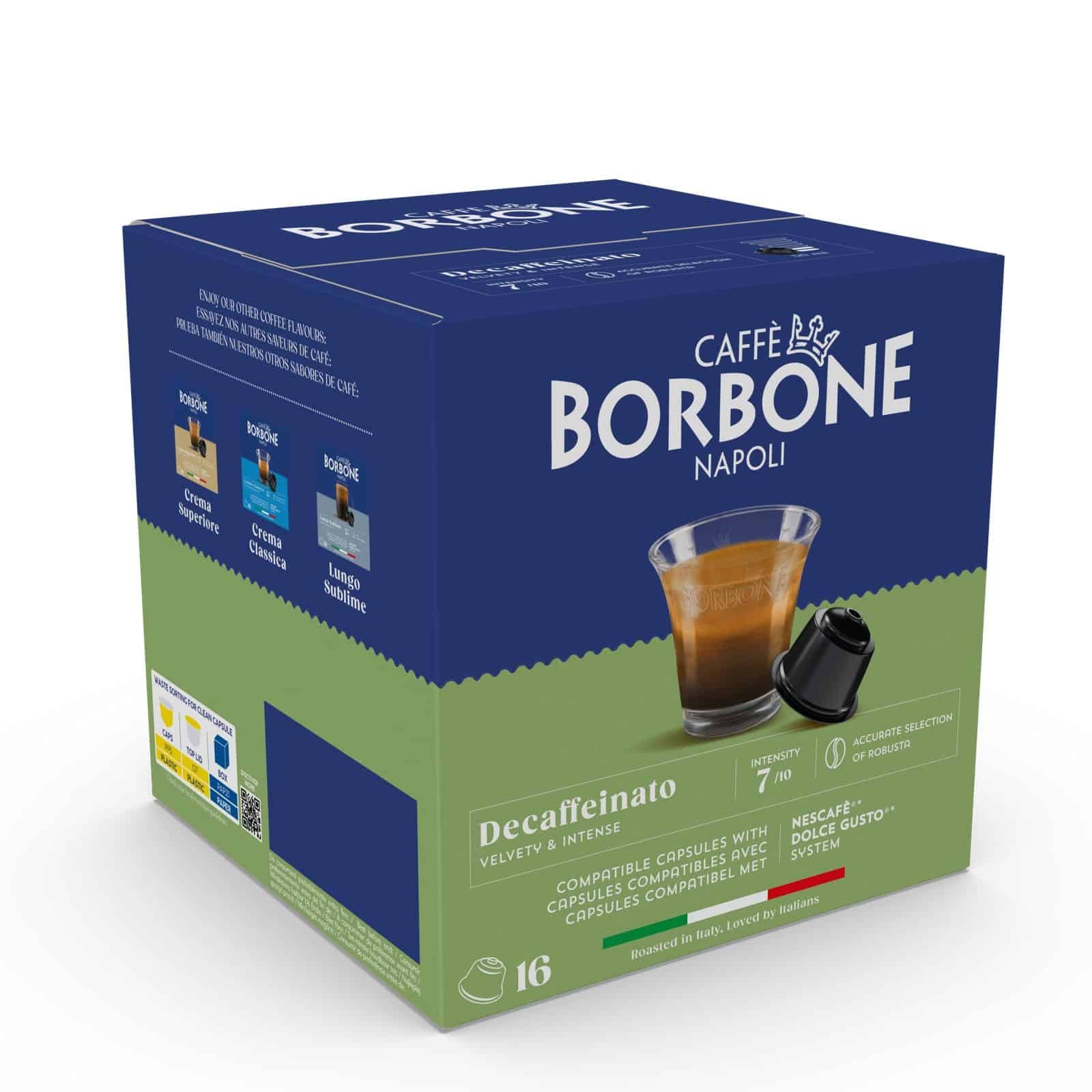Confezione da 16 capsule Dolce Gusto Miscela DECAFFEINATO Caffè Borbone. Forte, decisa e dal carattere inconfondibile.